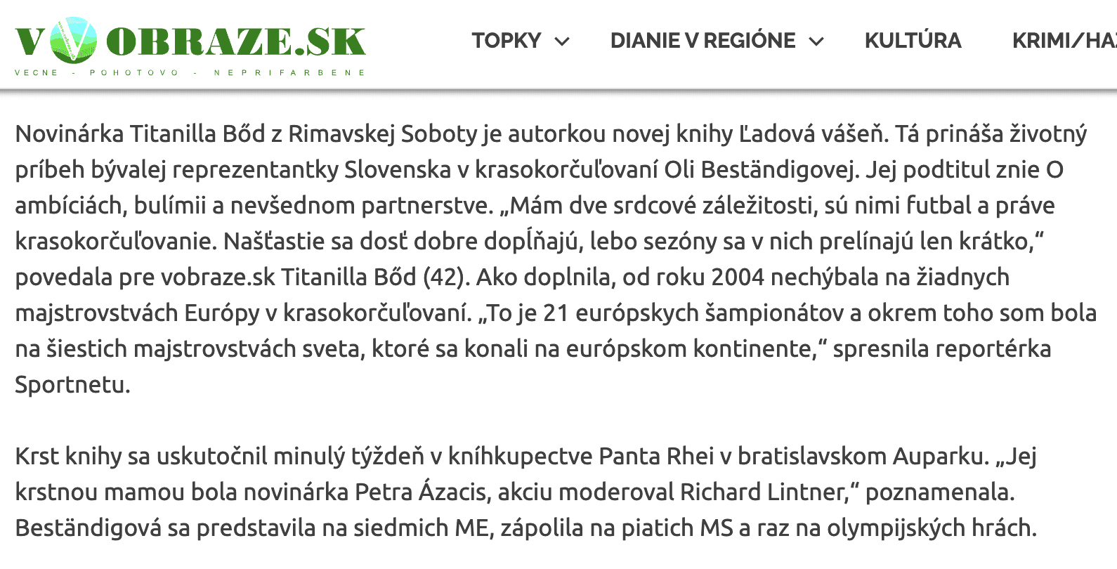 Titanilla Bőd napísala knihu Ľadová vášeň. O ambíciách, bulímii a nevšednom partnerstve (Vydavateľstvo M KREO) o Oli Beständigovej, bývalej reprezentantke Slovenska v krasokorčuľovaní. Viac informácií: https://vobraze.sk/kultura/novinarka-titanilla-bod-z-r-soboty-napisala-knihu-o-byvalej-reprezentantke-v-krasokorculovani/.
