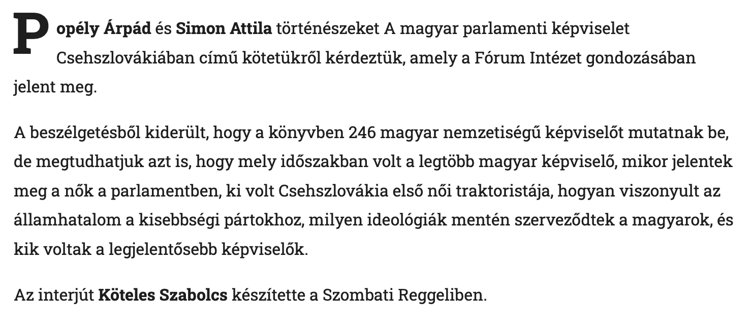 Homályba vész a magyar nemzetiségű parlamenti képviselők élettörténete. Popély Árpáddal és Simon Attilával Köteles Szabolcs beszélgetett a Pátria Rádióban. A beszélgetés a Pátria Rádió honlapján hallgatható meg.